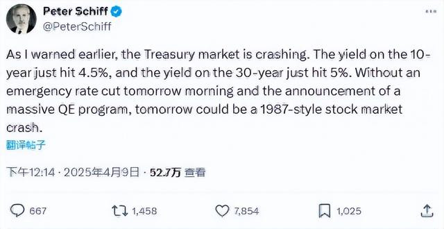 - 美债市场雪崩:10年期美债收益率飙至4.5%,30年期突破5%,创疫情以来最高纪录。知名经济学家彼得·希夫警告,若美联储今夜不紧急降息+QE,1987年“黑色星期一”式崩盘或重演。
